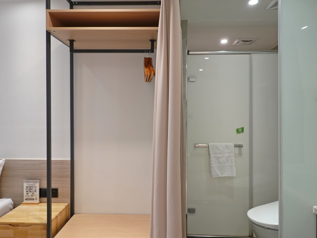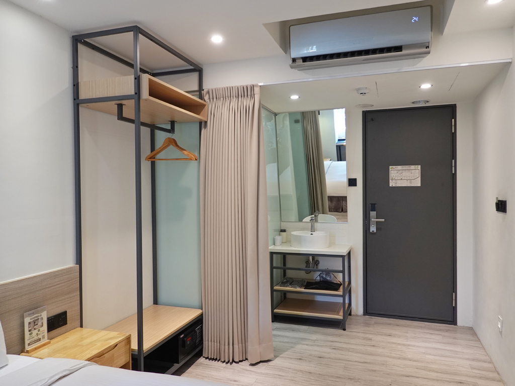 拉簾旁是開放式衣櫃,少了門片也能輕易將行李擺上整理,吊掛衣物也更為方便。洗手台則是和衛浴空間分開,避免爭搶浴廁的狀況發生,也能最有效率的達到每個空間的效用。