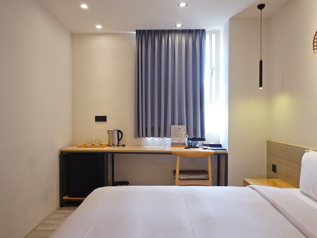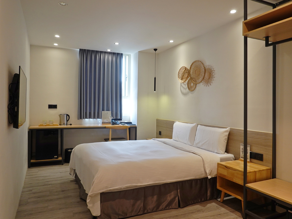 這次入住的是標準雙人房,雖坪數約只有七坪,但可以說是麻雀雖小,五臟俱全。雙人床、長桌、開放式衣櫃、電視等應有盡有,在裝潢風格上沒有多餘的裝飾,走簡約路線。