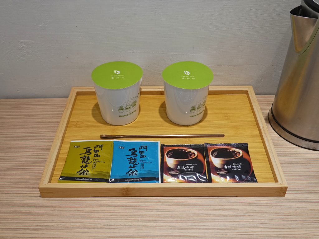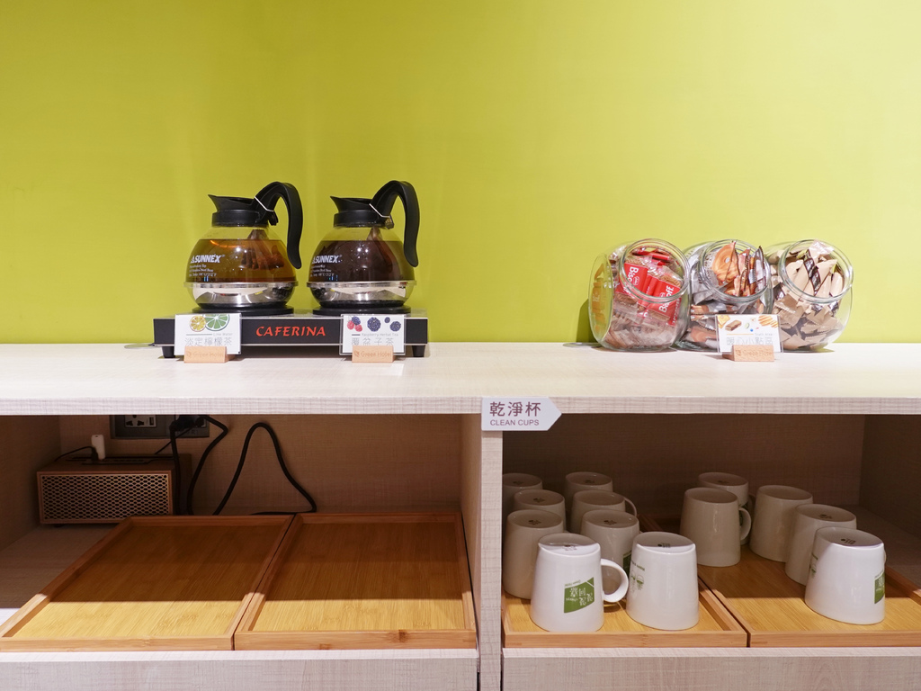 長桌上還有提供熱水壺、杯具及茶包與咖啡。