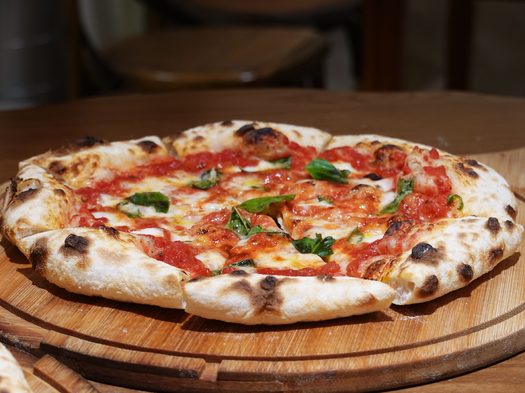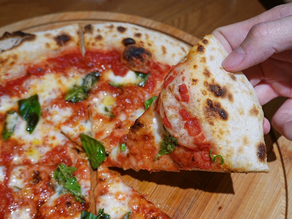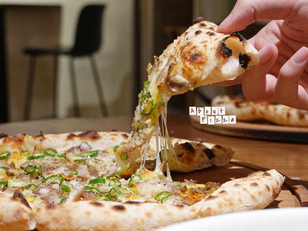 「About Pizza」的餅皮結合了厚、薄披薩的優點,外圍鬆厚帶咬勁,底層則是焦香薄脆;再者,番茄醬應也是店家自製,帶有極為平衡的酸甜鹹味,起司的奶香跟羅勒的清香與其完美交織,讓我將澱粉攝取量完全拋在腦後,肆無忌憚地將披薩一口又一口的送入嘴巴內。