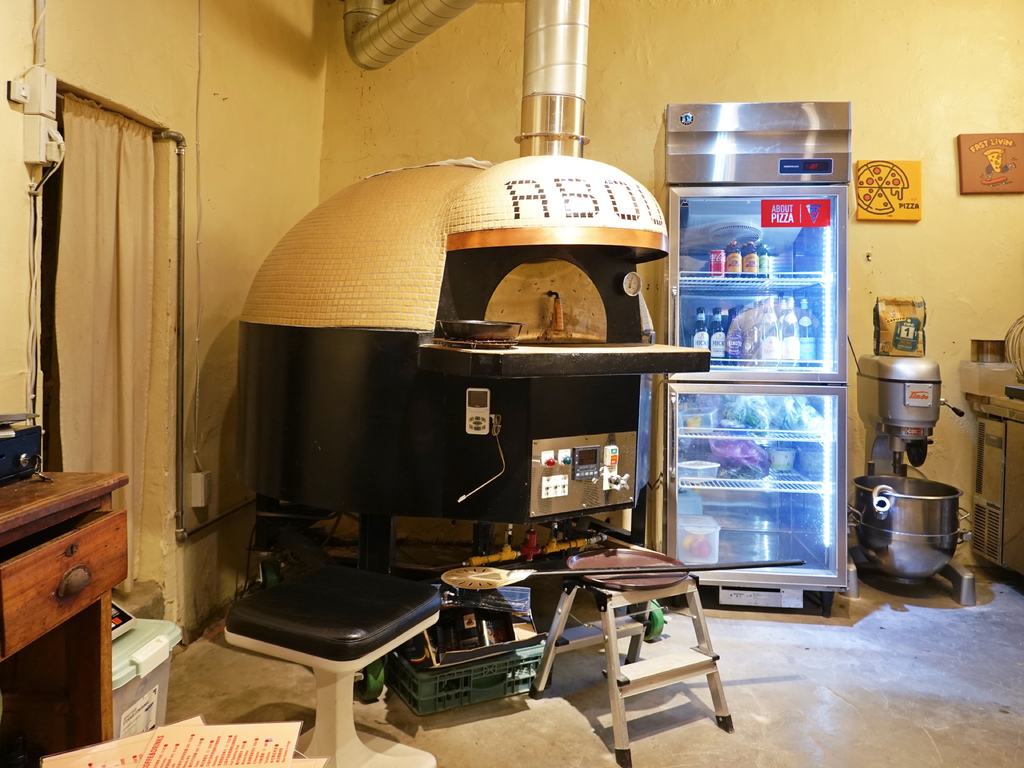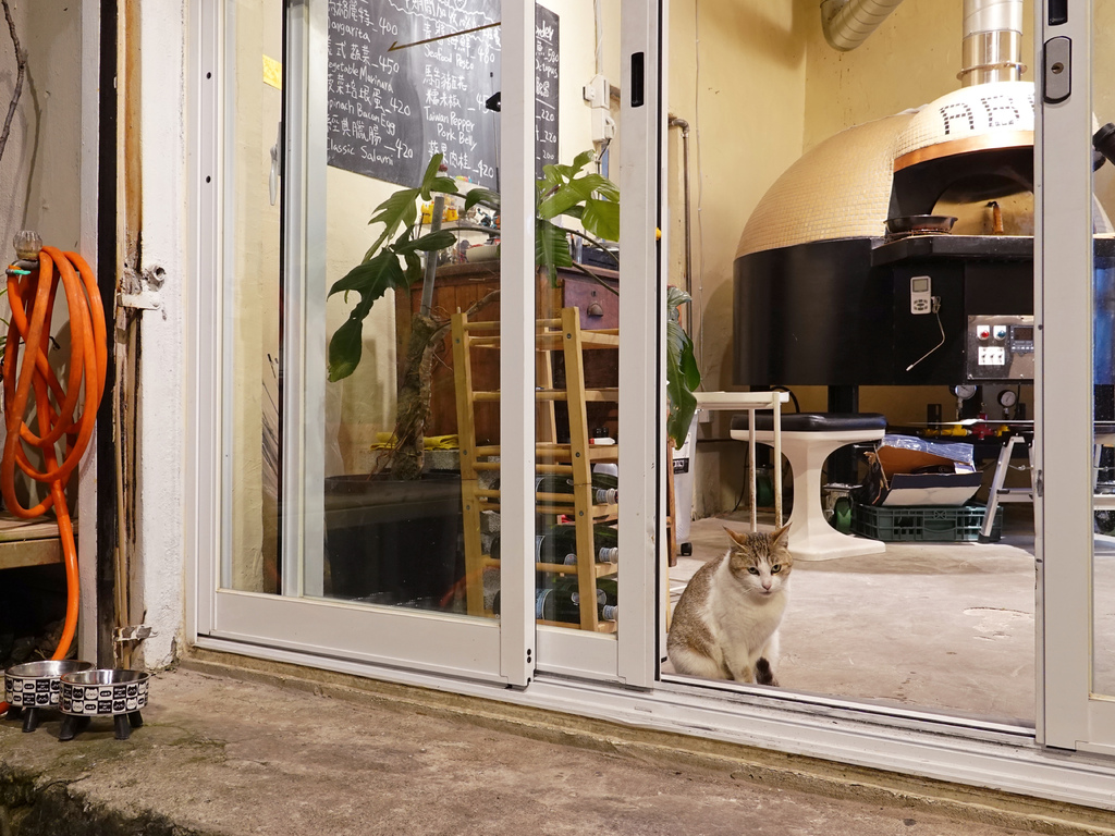 一樓主要是廚房,由門外可見廚師的工作檯以及窯烤爐,還有一隻融入瑞芳般慢活愜意的貓。