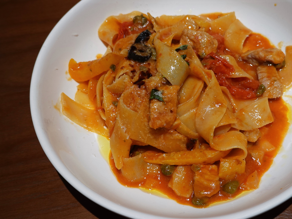 風塵女義大利麵是「About Pizza」義大利麵的招牌口味,以自製紅醬為基底,加上辣醬、酸豆、鯷魚等有著強烈風味的配料,還有脆口的豬頸肉,辣度、酸度都有,醬汁收汁也收得很好,牢牢扒在自製寬麵上,口感極佳。