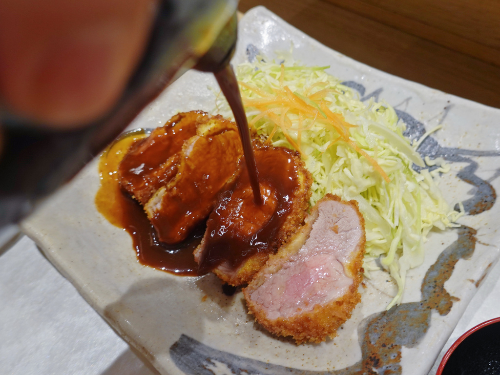 選用南九州豬的腰內肉部位,並裹上自製的麵包粉後酥炸,由於沒有經過拍打,所以肉排保有一定的厚度,熟度是仍帶有一些粉紅色澤的九分熟,炸功了得。