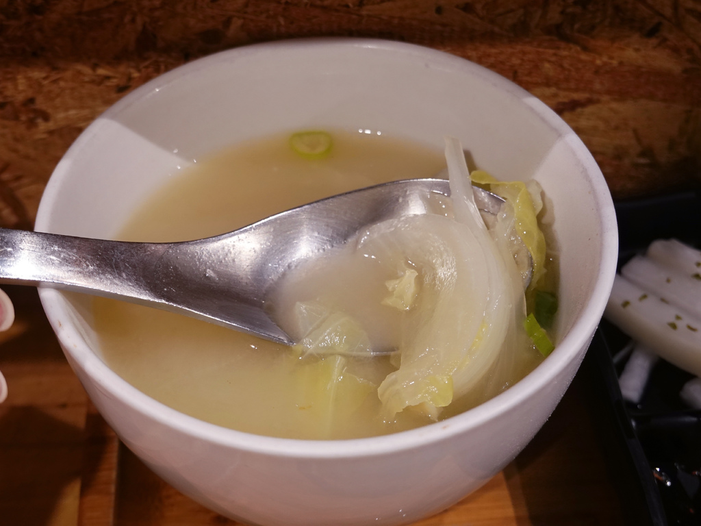 附餐的味噌湯裏頭還有不少的洋蔥及高麗菜,口味主要來自於食材本身,以及淡淡的味噌風味,是有用心也不會過於負擔的一道湯品。