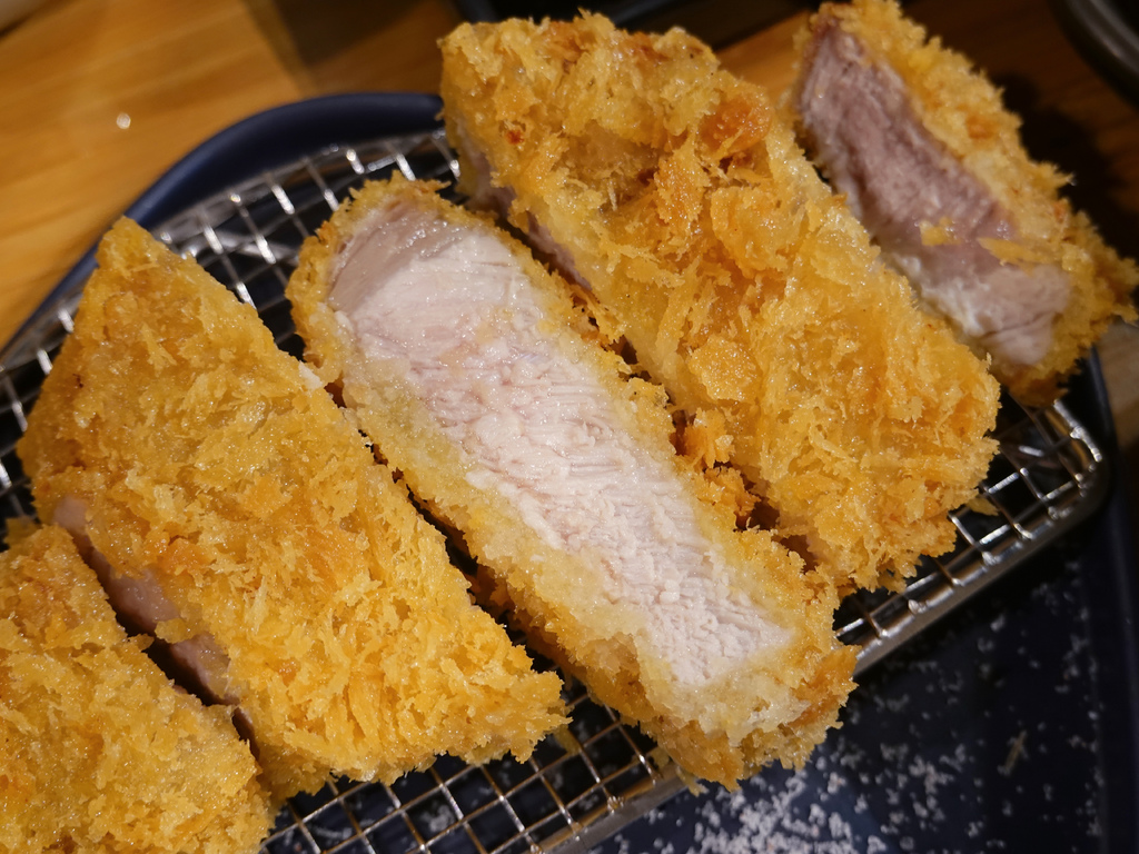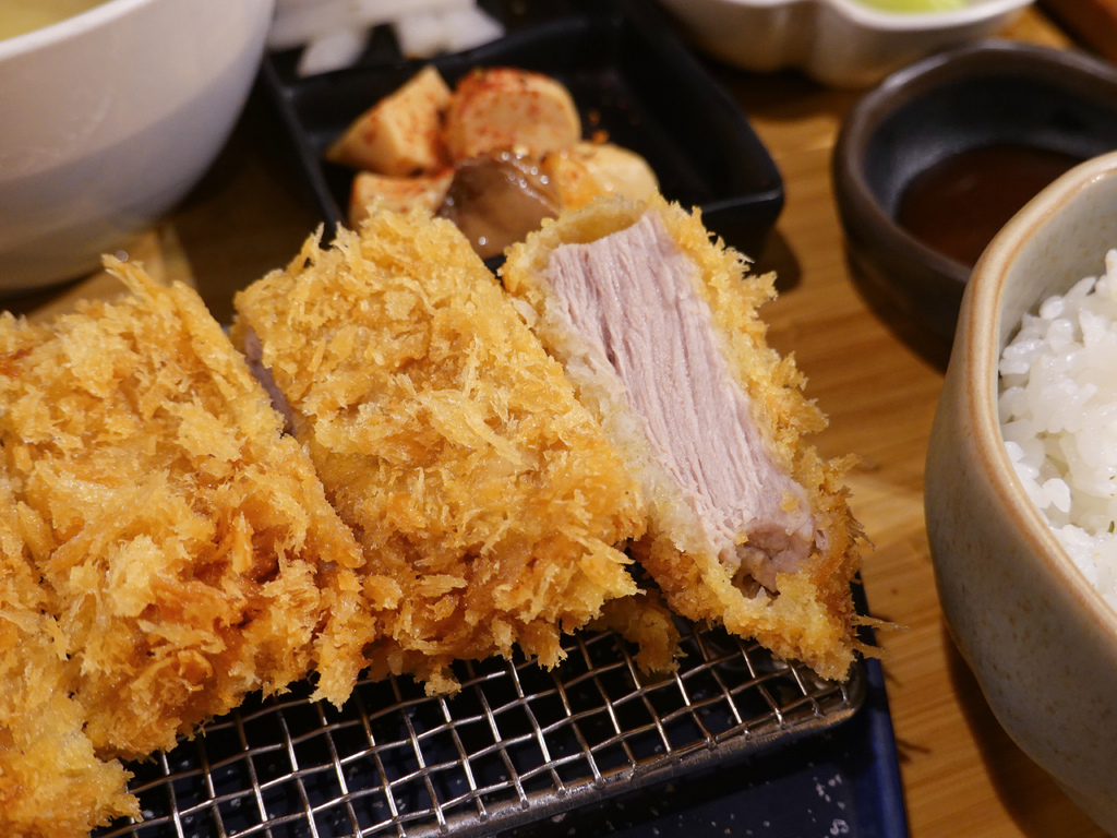 現炸的豬排果然不會讓人失望,不僅透著玫瑰色般的色澤,還冒著蒸氣。稍粗的麵衣咬起來喀滋作響,腰內肉肉質軟嫩不已,伴隨著肉汁,真的超級滿足,單吃不沾佐料,原味就很美味。