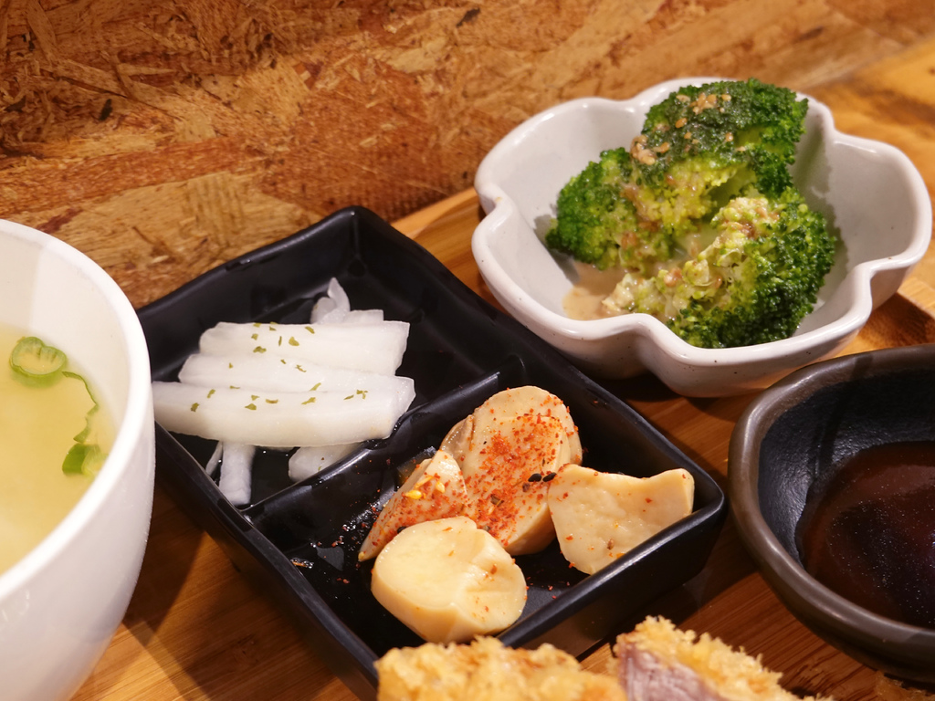 有別於炸豬排的解膩好夥伴-高麗菜絲,「初·仨食」的配菜是醃蘿蔔、七味粉杏鮑菇以及胡麻醬花椰菜,都為冷盤類型,調味不重,吃起來頗為清爽,但稍微美中不足的是單品似乎不太會作更換,我想,這應該是兩人作業所做的取捨。