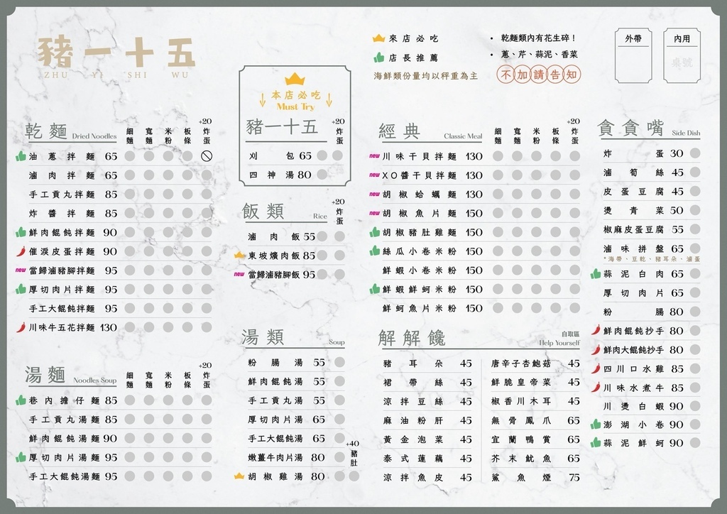 「豬一十五」的老闆,就是個小吃狂熱者,從刈包到爌肉飯他都愛,更不用說是一碗碗熱騰騰的眷村麵,在琳瑯滿目的菜單品項上不難看出他的野心;而吃得飽、吃得舒服、隨時吃得到,則是他對於「豬一十五」更進一步的期許,所以無限暢飲的飲料、十二小時包辦午餐到宵夜的營業時間、寬敞舒適都用餐空間,也表顯出他的滿滿誠意。