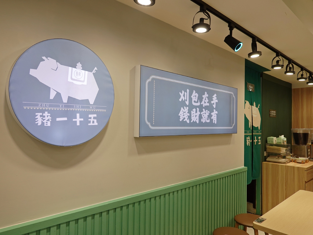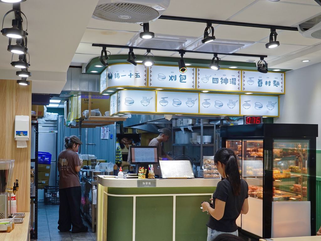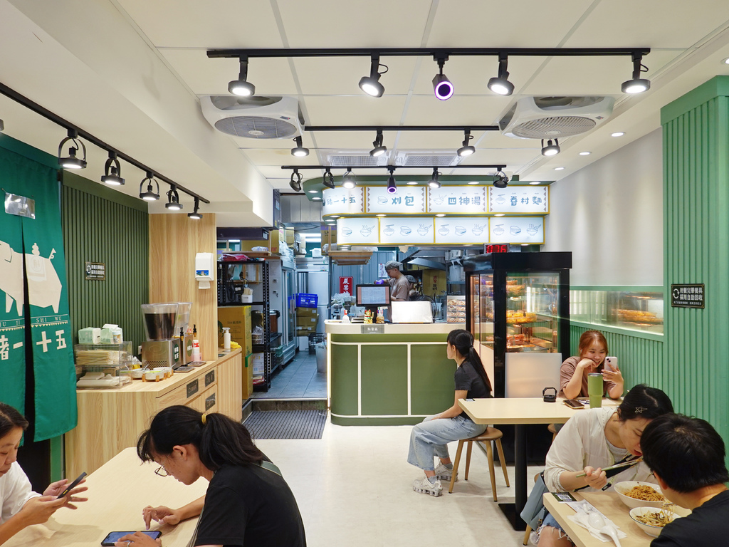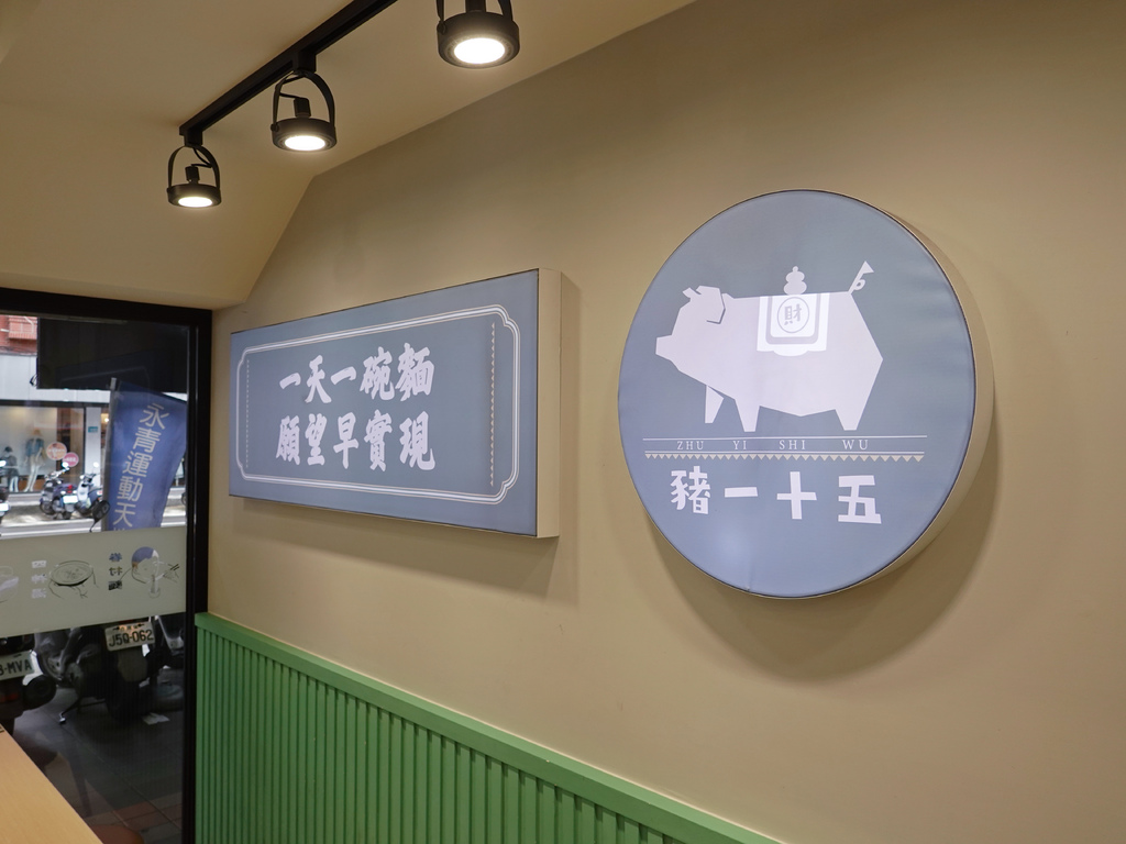 有別於一般的小吃麵店,「豬一十五」的空間乾淨明亮,以綠色作為品牌色,將深淺不一的綠色充斥在店內各處,打造舒適的用餐氛圍。