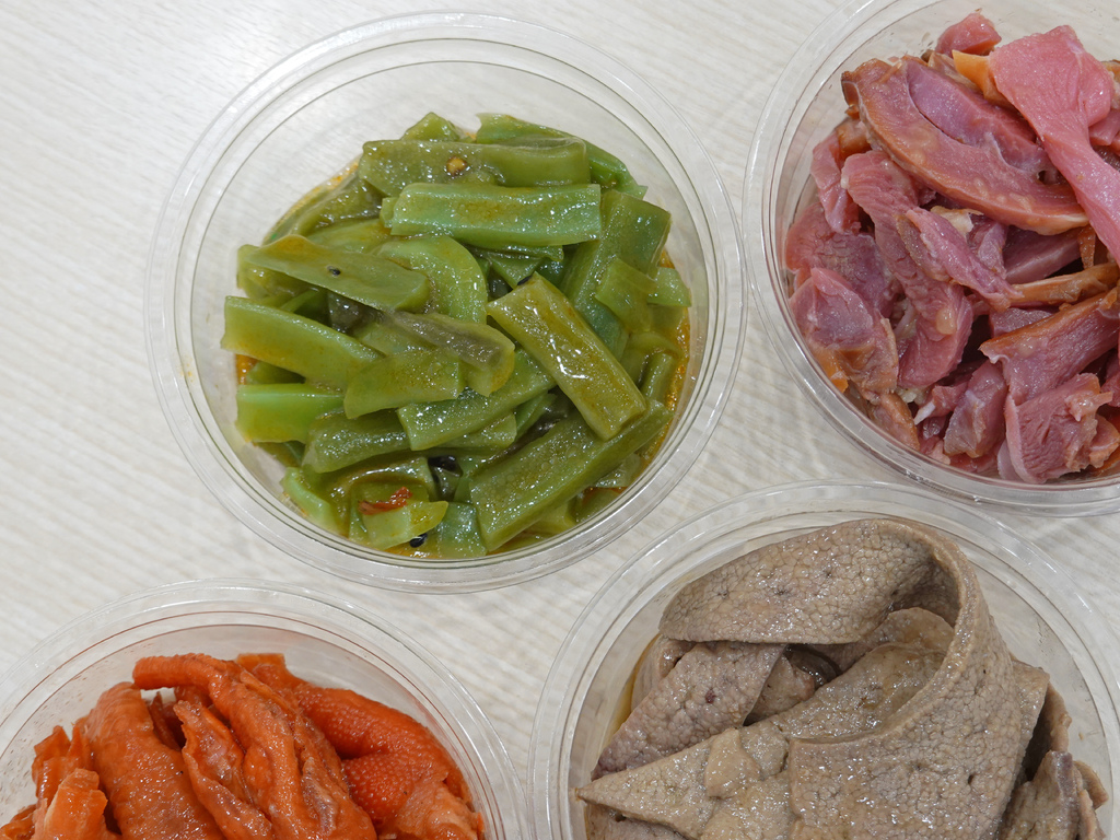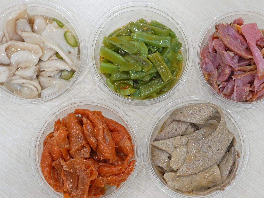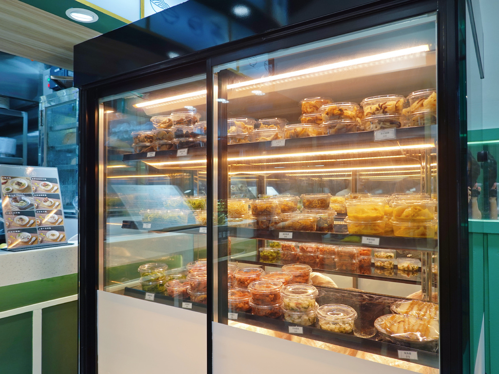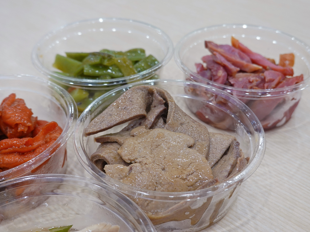 多種選擇的小菜被裝在塑膠盒內,並整齊的擺放在櫃台旁的冰箱,不僅看起來乾淨,衛生程度也很加分。不要看他小小一份,但內容物都被壓得挺實,內用時甚至看到有客人只包小菜回家,其人氣可見一斑。