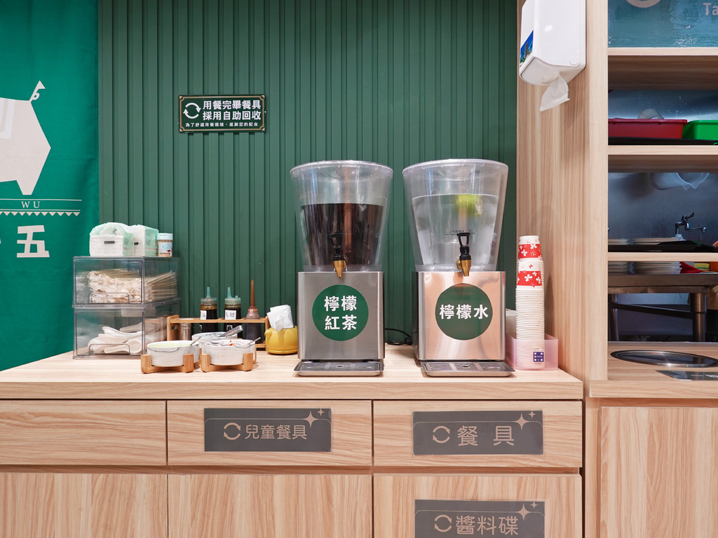 很少看到有麵店提供喝到飽的檸檬紅茶跟檸檬水,一旁也有酸菜、蔥花、辣椒、醬油等調味料可供取用。
