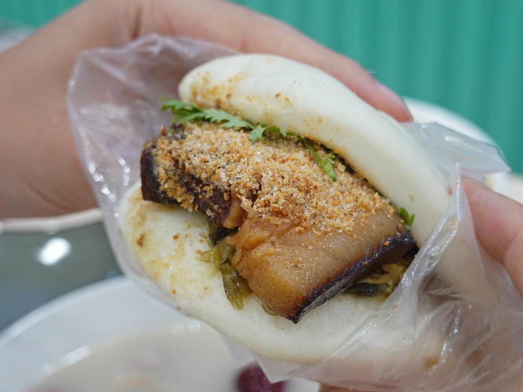 上頭灑滿滿的是帶有糖粒的花生粉,再加上酸菜和香菜的點綴,整體鹹中帶甜,瘦肉偏多,有著多樣的口感與香氣,是我可以接受的刈包類型。