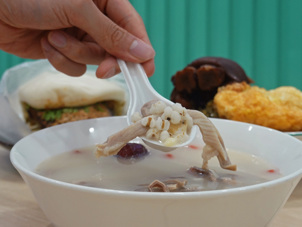 以大骨與中藥材熬煮而成的乳白色湯頭,喝起來很溫和,沒有令人不適的苦味,帶著淡淡的酒香,鹹度也很適中。