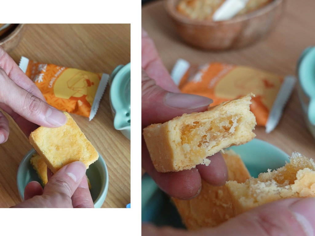 「凱樂烘焙」的鳳梨酥是傳統類型,酥鬆餅皮包裹著的,是鳳梨餡與冬瓜醬的懷舊組合。