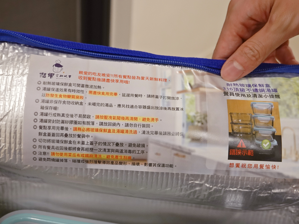 裝食物的保溫袋其實很容易有食物的湯水髒污或是不適的味道,但「想饗宅配晚餐」的保溫袋既新又乾淨,這點讓我對於餐點本身的品質更放心。