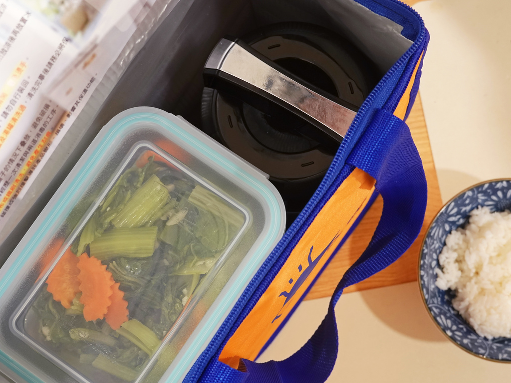 四菜一湯被穩妥的放置在保溫袋內,看起來這尺寸應該是有精準丈量過,可以減少車輛行駛所造成的晃動潑灑,看起來也很整齊、賞心悅目。